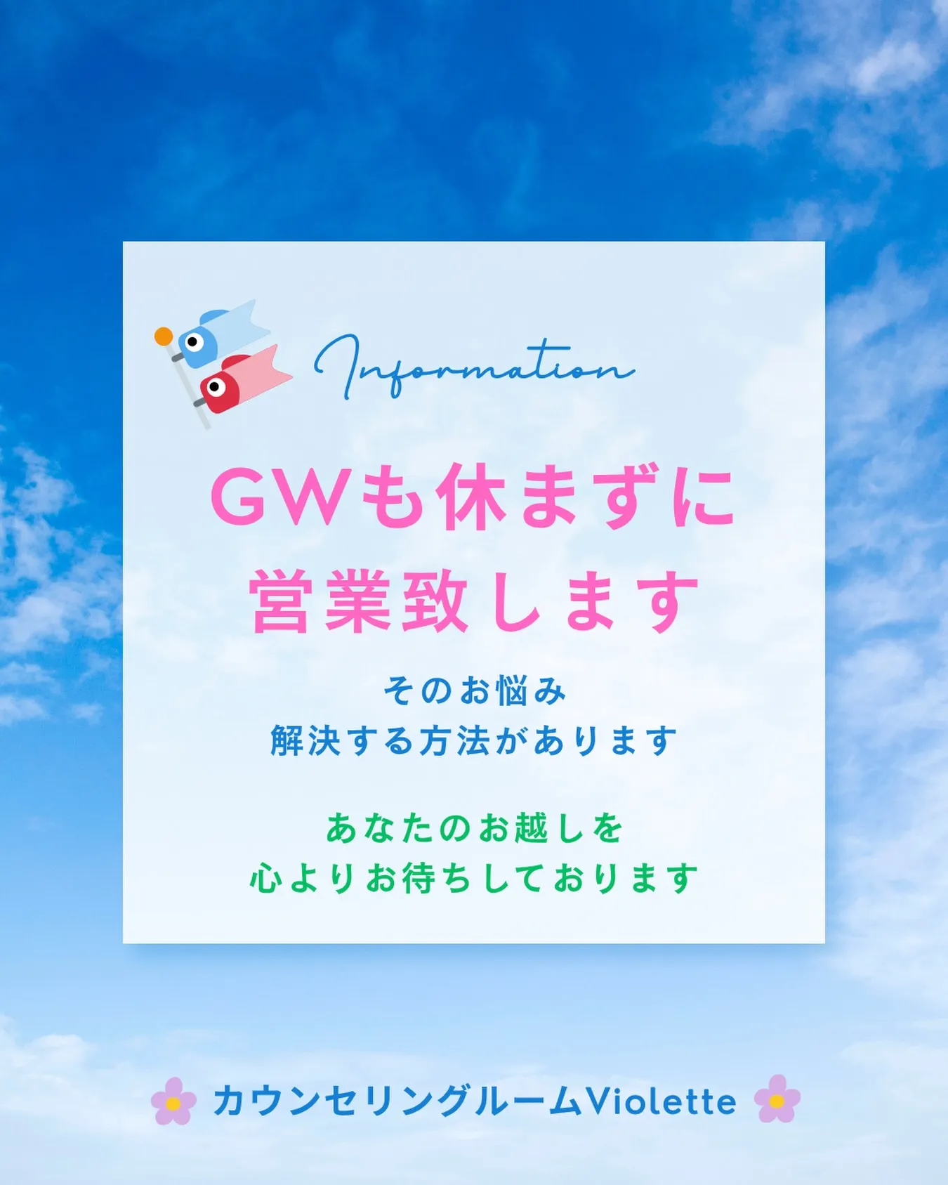 カウンセリングルームVioletteは、GWも休まず営業いたします。